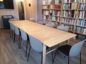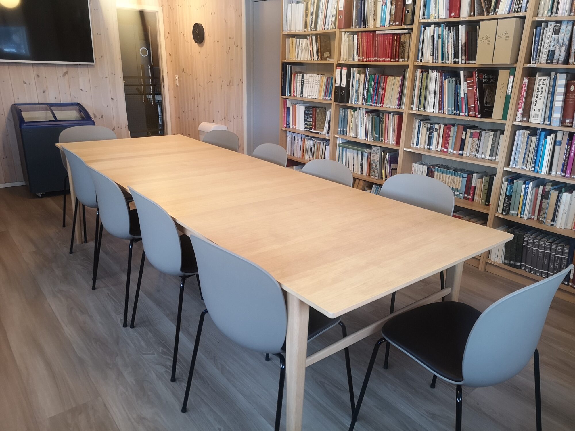Biblioteket finner du også i hovedbygget. Her er det sitteplass til 10 personer. Det er en praktisk storskjerm der du kan plugge inn egen pc. Tilgang på kjøkken.